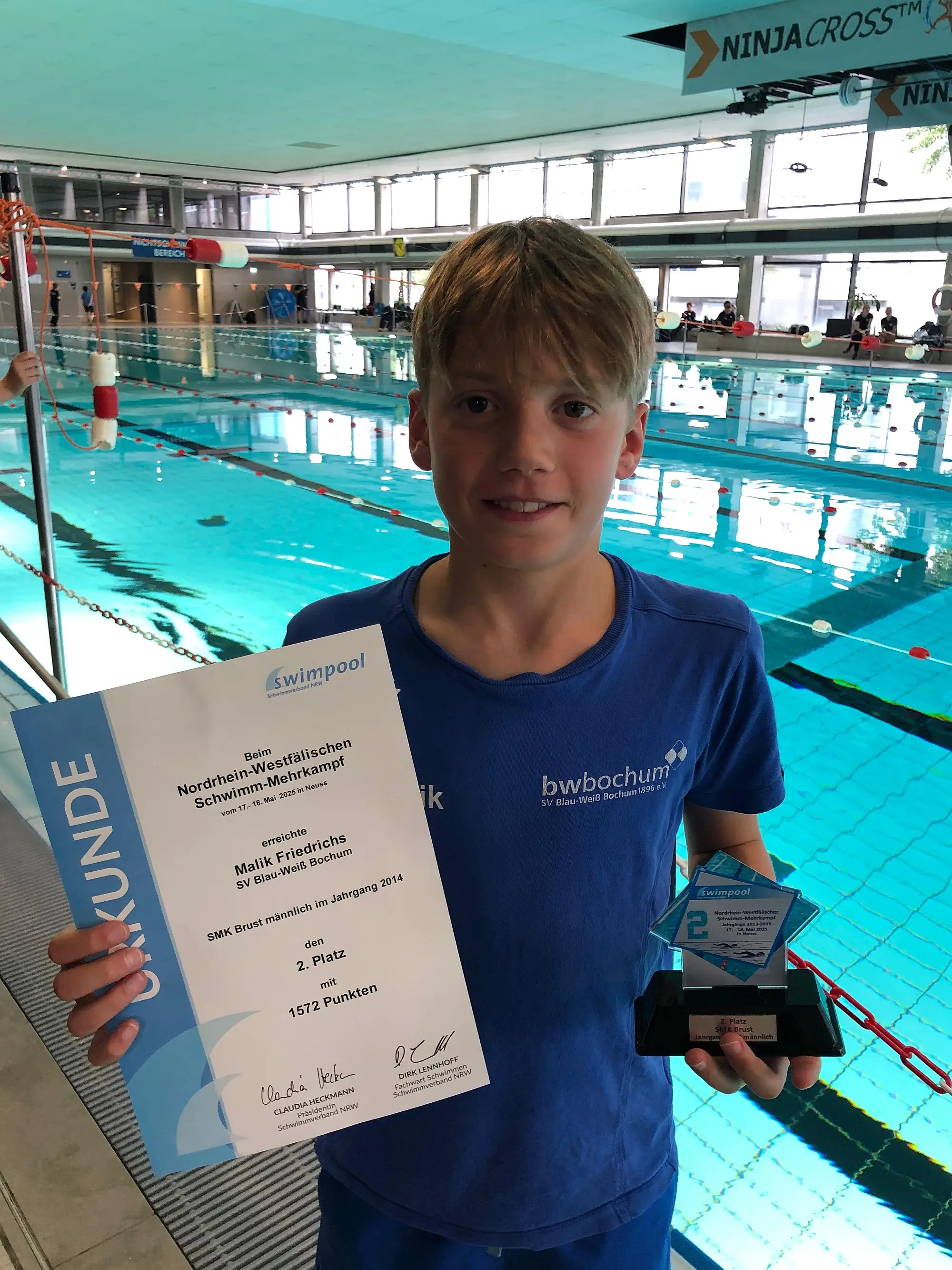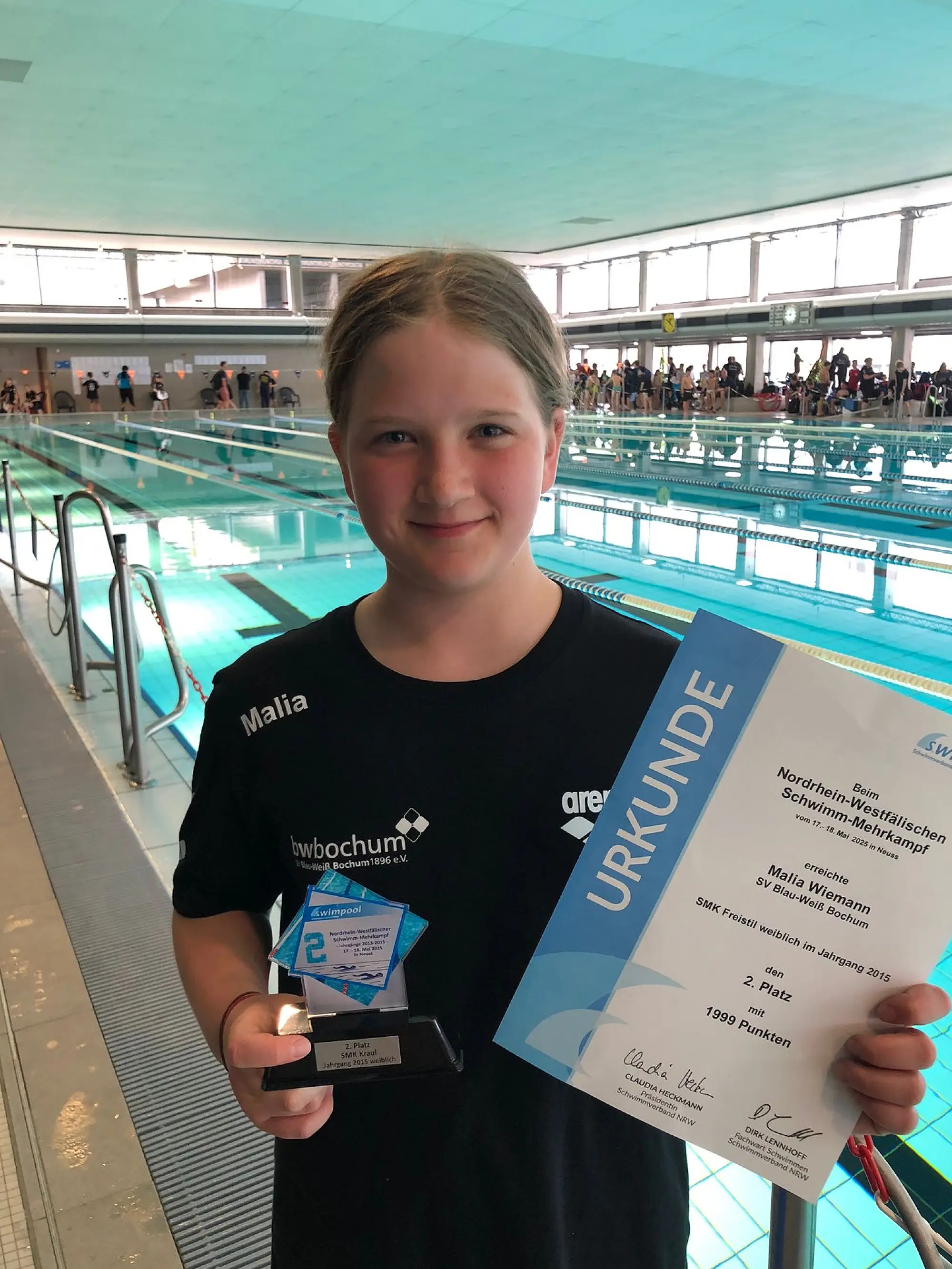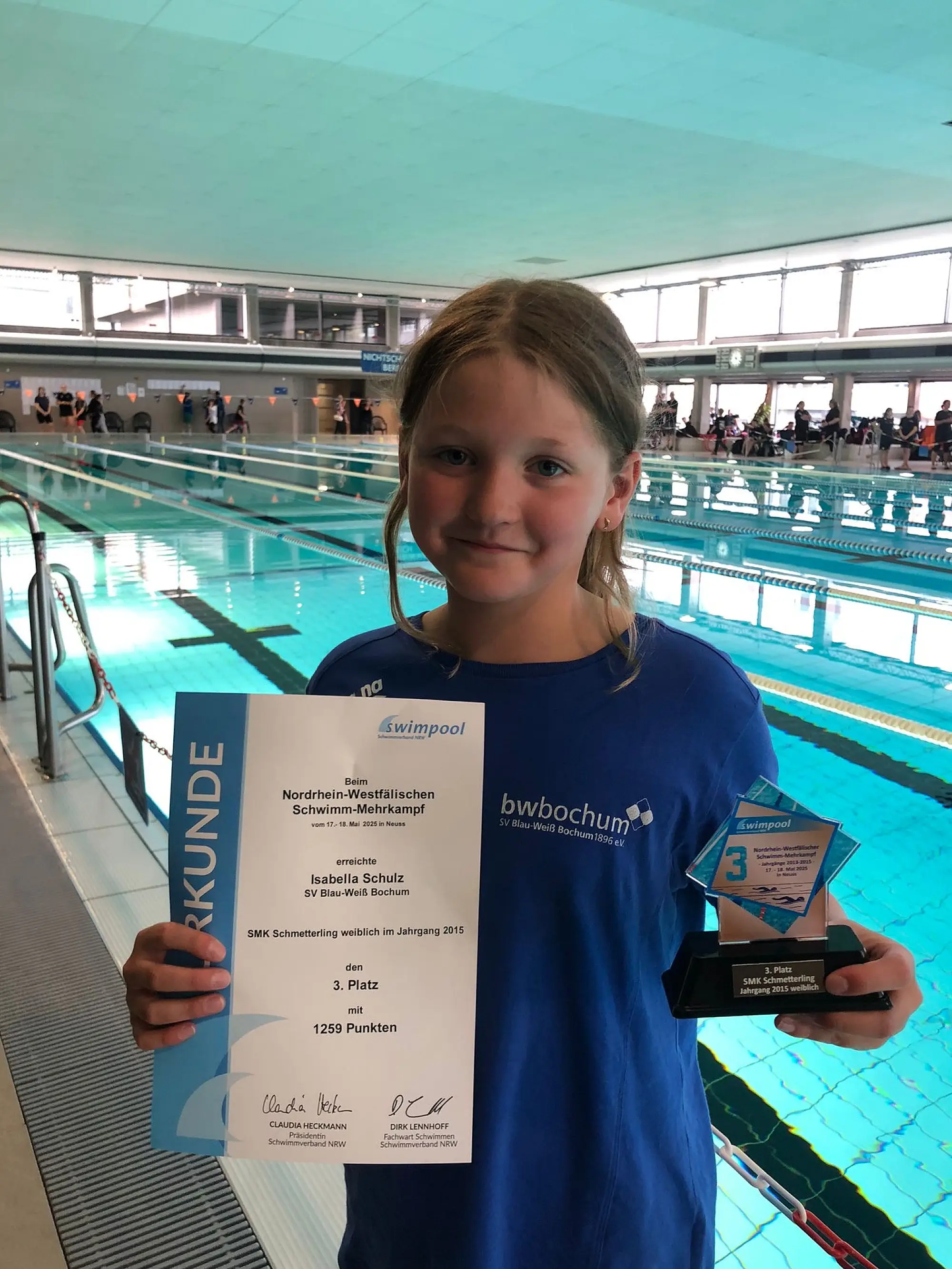 Auch in diesem Jahr konnten sich die 40 besten Schwimmerinnen und Schwimmer der Jahrgänge 2013-2015 über die 200m Lagen Strecke für den Schwimm-Mehrkampf (SMK) qualifizieren. Vom 17.-18.05.2025 wurde der SV Blau-Weiß Bochum von insgesamt neun Sportlerinnen und Sportlern vertreten. So viele Teilnahmen gab es bisher noch nie. Auf dem Wettkampf hatten die Kinder Chance ihre Vielseitigkeit auf Landesebene unter Beweis zu stellen.