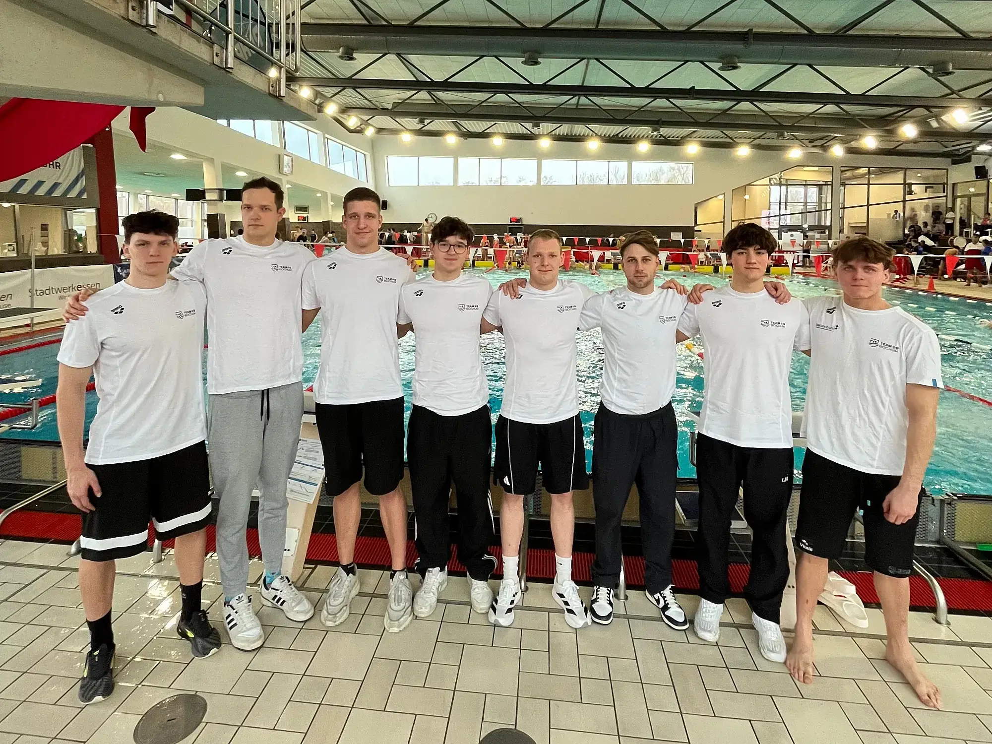Die erste Herrenmannschaft traf am 3. Adventswochenende im Essener Thurmfeldbad in der ersten Bundesliga auf die Spitze der nationalen Konkurrenz. Minimalziel der Bochumer war der Klassenerhalt im Oberhaus. Mit Platz 6 nach dem ersten Wettkampftag konnten sie zuversichtlich am Sonntag in den den zweiten Abschnitt starten. Viele individuelle Bestzeiten sorgten am Ende für deutlich mehr Punkte als erwartet. Herausragendes Einzelergebnis waren die 200m Freistil von Jarno Bäschnitt, der mit einer Zeit 1:43,87 sogar noch schneller unterwegs war als bei der Europameisterschaft im polnischen Lublin vor wenigen Tagen. Am Ende konnte Team Bochum in der Besetzung Alexander Kühling, Ben Wichtermann, David Bauer, David Kyzymenko, Hendrik Bechtel, Jarno Bäschnitt, Nicolas Klüttermann und Vitalii Martynov auf 23.574 Punkte und den hervorragenden Platz 7 im Endstand blicken.